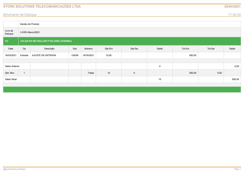 Kardex do produto, que permite o acompanhamento da evolução de um determinado produto. Chamado de Raio-X do movimento